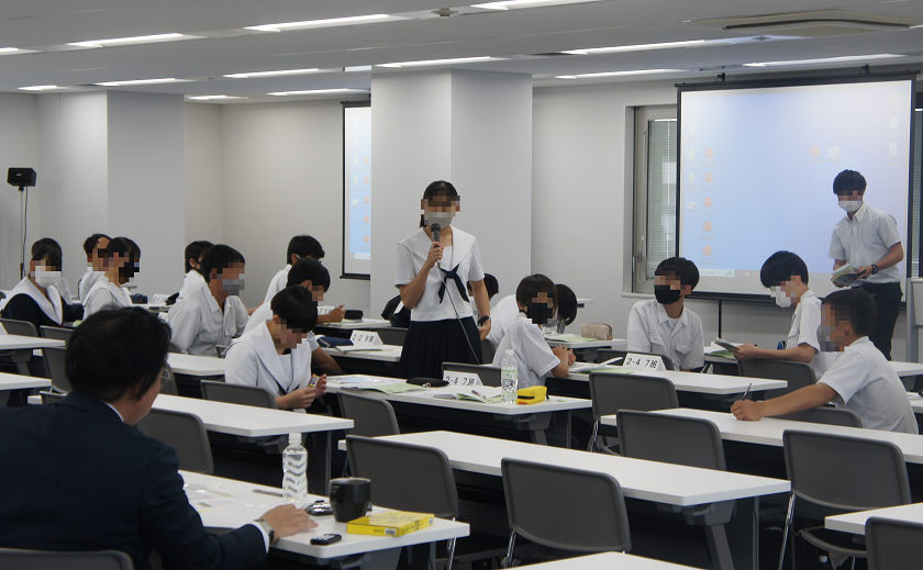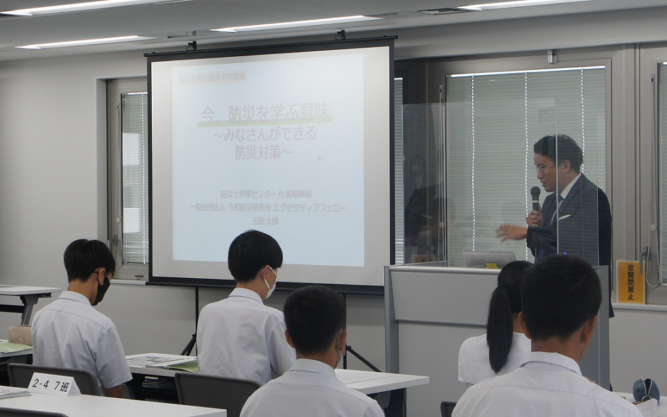 当日は、生徒の皆さんから、グループごとに防災や防犯についての発表がありました。各グループ緊張しながらもそれぞれ工夫を凝らして発表を行い、弊社代表の玉田が各グループにアドバイスや問いかけをすると、熱心にメモを取られていました