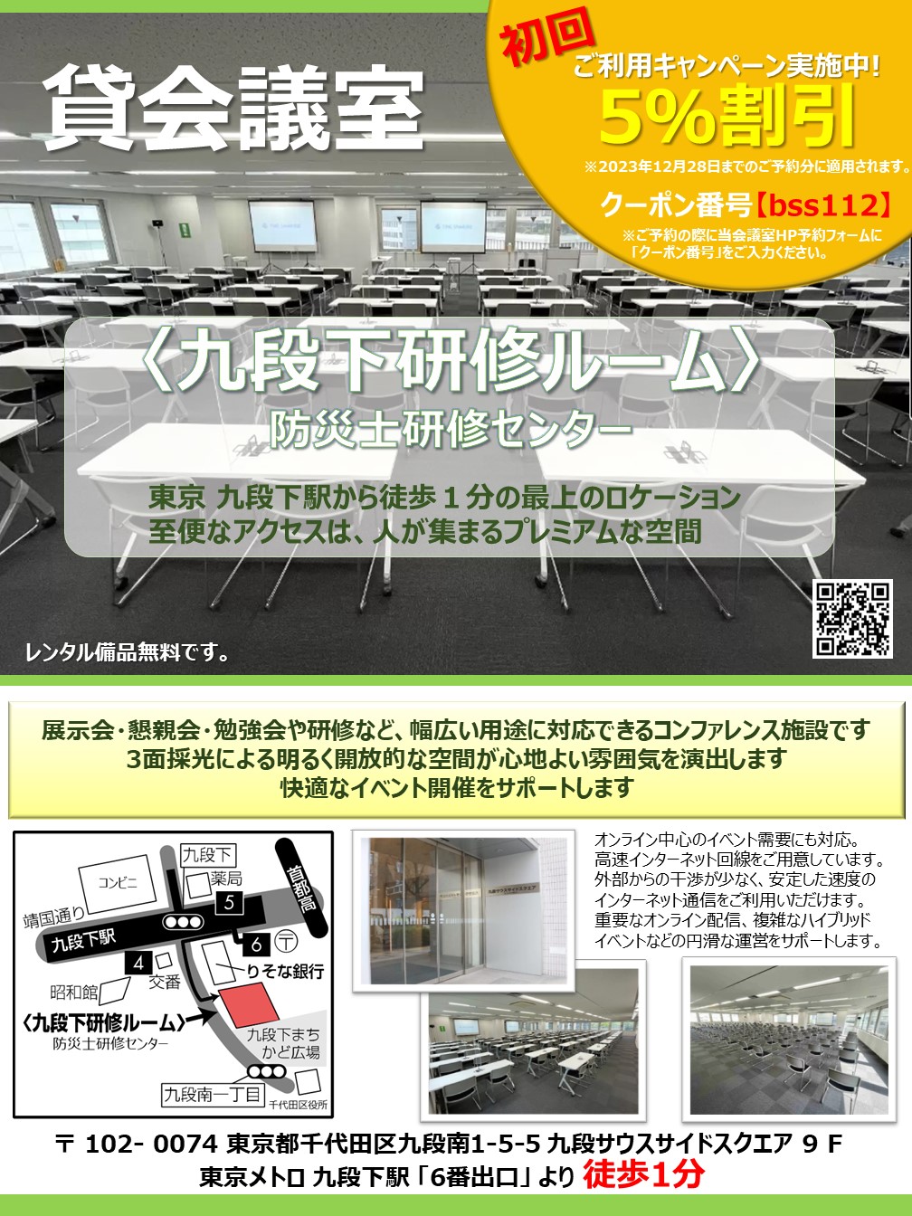 防災士研修講座を開催している「九段下研修ルーム」は、レンタル会議室としてご利用いただけます。下半期に入り、学会や業界のイベント、社内では社員研修や年末に向けての戦略会議なども増えるのではないでしょうか。飲食(軽食)も可能なため、終日での利用もしやすくなっております。ぜひご利用ください。