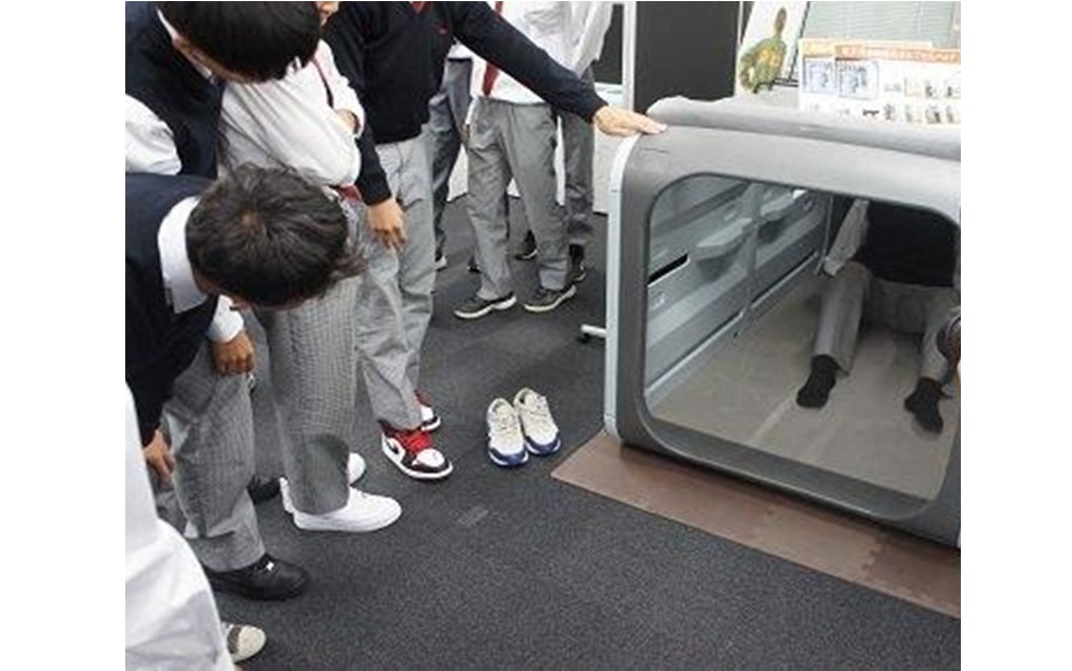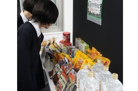 その後、生徒の皆さんには防災用品と防災士に関する展示を見学してもらいました。防災用品のコーナーでは、3人家族が7日間在宅避難するために必要なモノを、その物量を体感できるよう展示しました。様々な非常食に興味を示す生徒や簡易ベッドに寝転がってみる生徒がおり、実物を見る・触れることで防災への意識が高まったのではないかと思います。