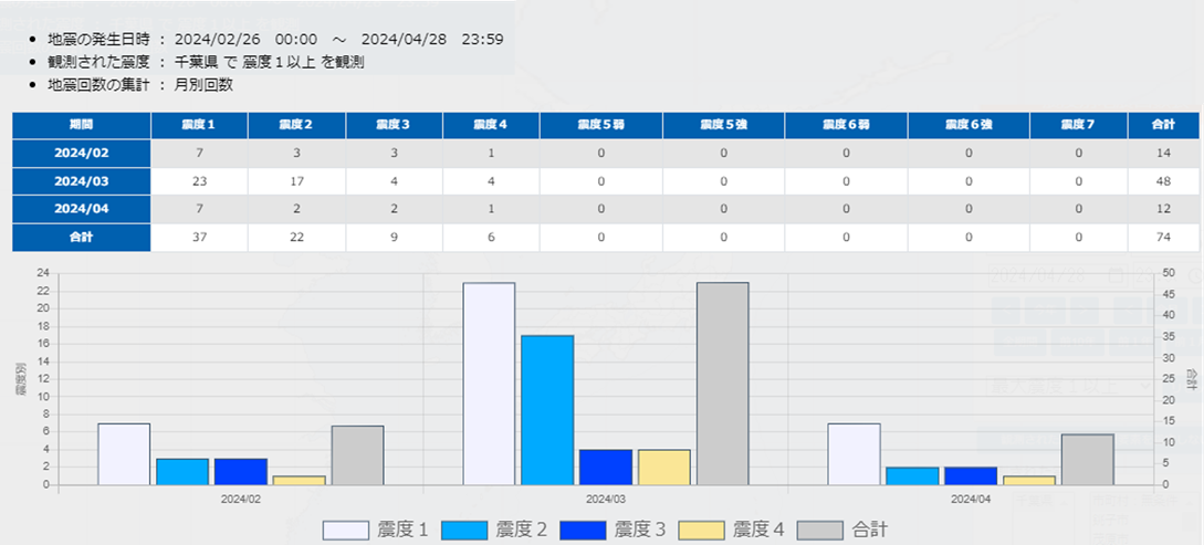 2024年2月下旬から千葉県東方沖を震源とする地震が相次いで発生しており、2月29日にM 4.9、そのおよそ11時間後にM 5.2の地震が発生し、地震活動が継続しています。ちなみに気象庁の震度データベース検索(※1)によると、2月26日から4月28日までに千葉県内で起きた震度1以上の地震は74回に上り、3月が最も回数が多く、4月に入ると回数は減っています。