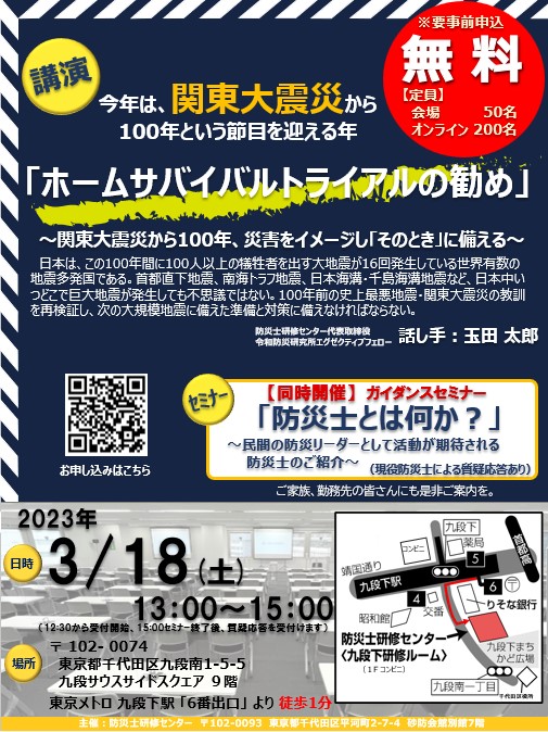 来たる3月18日(土)「防災士が勧める防災訓練 『ホームサバイバルトライアルの勧め』と題して、弊社代表・玉田太郎が講演を行います。先の震災対策技術展@横浜でご好評いただいた本テーマについて、“関東大震災から100年を経て、進化し続ける防災対策”という観点を盛り込み、さらに充実した内容でお送りします。